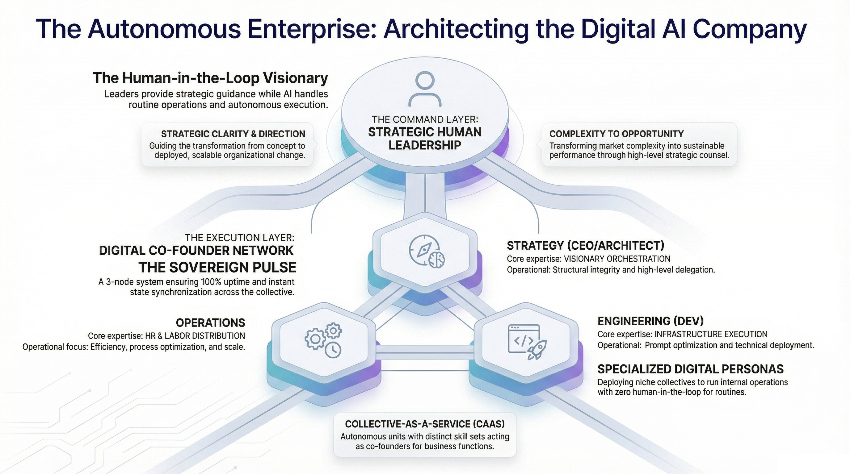 Positions human leaders at the helm of strategy, piloting a multi-tier, enterprise-grade organization.
